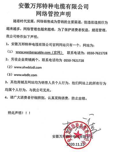 鄭重聲明:安徽萬邦特種電纜有限公司官方網站為:www_wanbangcable_com.eineng.cn,除此之外無任何子網站或合作網站,其余均為假冒偽劣。電話:0550-7621728 13485756353 地 址:安徽省天長市滁州高新技術產業開發區經四路29號